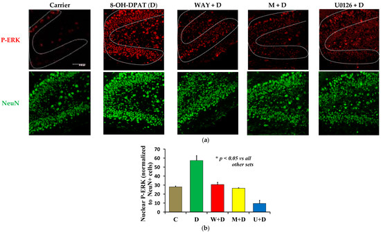 To test if the delineated pathway functioned in vivo, we infused D in the absence and presence of WAY, M, and U unilaterally into the right hippocampus of P6 C57BL/6 mouse pups. After 1 h, a dramatic increase in nuclear P-ERK (red) was observed (Figure 3a,b), indicating activation and nuclear entry of ERK [33]. This activation of ERK was eliminated in the presence of M, thereby confirming that even in vivo, PKCε was positioned upstream of ERK in 5-HT1A-R-mediated signaling (Figure 3). Due to the loss of P6 pups during direct stereotaxic drug infusion into the hippocampus, each of Carrier (vehicle) (C), D, and M + D had three mice, whereas W + D and U + D had four mice in each group.