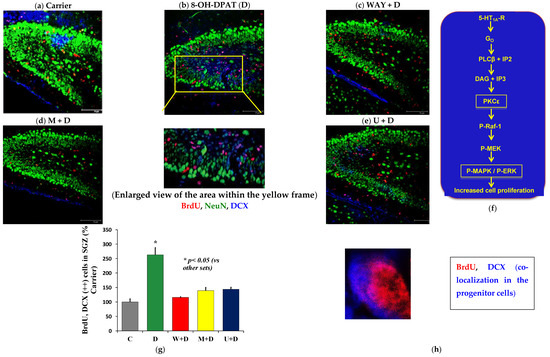 Systemic (i.p.) injection of 5-bromo-2′-deoxyuridine (BrdU) in P6 pups followed by infusion of D in the absence and presence of WAY, M, and U into the right hippocampus revealed a marked increase in BrdU, DCX double-positive cells in the D-treated brain sections (p < 0.05) (Figure 4a,b,g), but not in the presence of WAY, M, and U (Figure 4c–e,g). This confirmed the involvement of the identified 5-HT1A-R signaling pathway via PKCε in neuroblast proliferation in the sub-granular zone (SGZ) of the DG at P6 (Figure 4f). 3D images at higher magnification showed the presence of the BrdU+ nucleus (red) surrounded by the DCX+ (blue) cytoplasm (Figure 4h). Although our experiments included five pups per treatment group, due to the loss of P6 pups during intra-hippocampal infusion of drugs, we finally acquired data from three mice per treatment group.