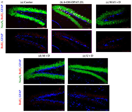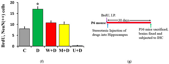 For all the neuroproliferation and neurogenesis studies, the pups were injected with BrdU (100 mg/kg) intra-peritoneally (I.P.) 2 h prior to intra-hippocampal injection of drugs [45,46]. The proliferating cells were then detected with antibodies against BrdU (Sigma, St. Louis, MO, USA), and counter-probed with antibodies against DCX, NeuN, or GFAP.