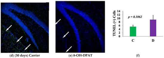 Neither 24 h (Figure 6a–c) nor 30 days (Figure 6d–f) after intrahippocampal D treatment of P6 mice yielded any decrease in TUNEL (+) (green) apoptotic cells. Thus, rather than causing neuroprotection, above-basal activation of the 5-HT1A-R elicited formation of more neurons in the DG. Intriguingly, in the 30-day group, D treatment blocked apoptosis in the other neurogenic niche, the subventricular zone (SVZ) (ventral to the DG) (shown using white arrows).
