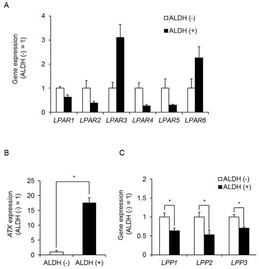 We have previously reported that the lysosphingolipid sphingosine-1-phosphate mediates the CSC phenotype, which can be identified as the ALDH-positive cell population in several types of human cancer cell lines []. To investigate whether additional lysosphingolipids regulate the frequency and maintenance of BCSCs in TNBC, we performed a quantitative polymerase chain reaction (qPCR) assay to detect lysosphingolipid receptors that were upregulated in ALDH-positive MDA-MB-231 cells. LPAR3 and LPAR6 expression was upregulated in ALDH-positive cells compared with ALDH-negative cells (Figure 1A). Since the expression level of LPAR3 in ALDH-positive cells was 13.2-fold higher than that of LPAR6 in ALDH-positive cells (Figure S1), we focused on LPAR3 in BCSCs. To investigate the involvement of LPA, we next examined the expression levels of LPA-related enzymes. As shown in Figure 1B, ATX, an enzyme involved in LPA synthesis, was also upregulated in ALDH-positive cells, while LPPs, which degrade LPA, were decreased. These results suggest a possible role for LPA metabolism in regulating CSC levels (Figure 1C).