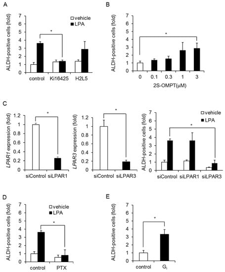 LPA increases ALDH-positive cells via LPAR3/Gi signaling in MDA-MB-231 cells. (A) Effects of LPAR1/3 and LPAR2 antagonists (Ki16425 and H2L5186303, respectively; both 10 µM) on the number of ALDH-positive cells after LPA treatment. Data represent the mean ± s.d. (n = 3). (B) Effect of the LPAR3 agonist 2S-OMPT on the number of ALDH-positive cells. Data represent the mean ± s.d. (n = 3). (C) Depletion of LPAR1 or LPAR3 with siRNA. Effect of LPAR1 or LPAR3 siRNA on the LPA-induced increase in ALDH-positive cells. Data represent the mean ± s.d. (n = 3). (D) Effect of PTX (100 ng/mL) on the number of ALDH-positive cells after LPA treatment. Data represent the mean ± s.d. (n = 3). (E) Effects of constitutively active mutants of Gi on the number of ALDH-positive cells. Data represent the mean ± s.d. (n = 3). * p < 0.05.