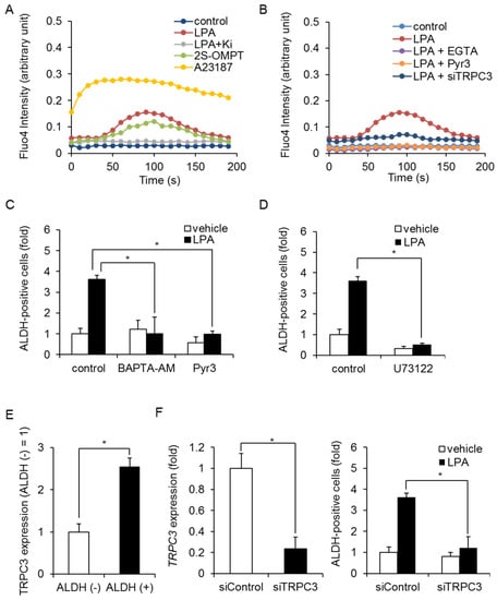 Growing evidence suggests that there are many similarities between embryonic stem (ES) cells and CSCs; therefore, we next evaluated the Notch, Hedgehog, and Wnt signaling pathways as candidate pathways downstream of LPAR3. Stimulation with LPA did not induce expression of the Notch target gene hes family bHLH transcription factor 1 (HES1), the Hedgehog target gene GLI family zinc finger 1 (GLI1), or the Wnt target gene dickkopf WNT signaling pathway inhibitor 1 (DKK1) in MDA-MB-231 cells (Figure S4A). In addition, self-renewal-related transcription factors Oct3/4, Nanog, Sox2, and c-Myc were not induced by LPA (Figure S4B). We then examined other signaling pathways that are involved in ALDH-positive cells. Since LPARs are known to mobilize Ca2+ in ES cells [], we examined calcium signaling. We found that LPA or 2SOMPT stimulation increased intracellular Ca2+, and the LPAR1/3 antagonist Ki16425 inhibited the LPA-induced increase in Ca2+ influx in MDA-MB-231 cells (Figure 4A). Calcium Ionophore A23187 was used to induce Ca2+ influx from outside as a positive control. Similar results were obtained with EGTA, which extracellularly inhibits Ca2+ influx from outside (Figure 4B). We next sought to identify involved calcium channels and focused on TRPC3, which plays a role in calcium homeostasis. As shown in Figure 4B, treatment with Pyr3, a selective inhibitor of TRPC3, inhibited the LPA-induced increase in Ca2+ influx. TRPC3 siRNA produced similar results. In addition, the LPA-induced increase in ALDH-positive cells was blocked by the membrane permeable Ca2+ chelator BAPTA-AM and Pyr3 in MDA-MB-231 cells (Figure 4C) and HCC1806 cells (Figure S5A). Since TRPC3 was known to be activated by diacylglycerol, which was produced by phospholipase C, we examined the effect of phospholipase C inhibitor U73122 on an LPA-induced increase in ALDH-positive cells. As shown in Figure 4D, U73122 inhibited an LPA-induced increase in ALDH-positive cells in MDA-MB-231 cells. In addition, TRPC3 expression was upregulated in ALDH-positive cells compared with ALDH-negative cells (Figure 4E). TRPC3 siRNA inhibited the LPA-induced increase in ALDH-positive cells in MDA-MB-231 cells (Figure 4F).