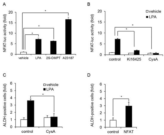 LPA-induced NFAT activation in MDA-MB-231 cells. (A) MDA-MB-231 cells transfected with a reporter plasmid encoding NFAT-luc were cultured with or without LPA (10 µM) or 2S-OMPT (3 µM) for 24 h and then analyzed by luciferase assays. A23187 (10 µM, 24 h) was used as positive control. Data represent the mean ± s.d. (n = 3). (B) Effect of Ki16425 (10 µM) or CysA (10 µM) on LPA-induced NFAT activation. Data represent the mean ± s.d. (n = 3). (C) Effect of CysA (10 µM) on LPA-induced increases in ALDH-positive cells. Data represent the mean ± s.d. (n = 3). (D) Effects of overexpression of NFAT on the number of ALDH-positive cells. Data represent the mean ± s.d. (n = 3). * p < 0.05.