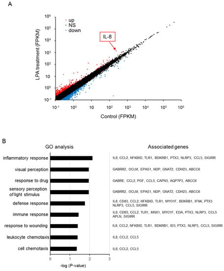 RNA-seq analysis of LPA-treated MDA-MB-231 cells. (A) Scatterplot showing the LPA-upregulated (red) and downregulated (blue) transcripts. (B) Gene ontology enrichment analysis of upregulated protein-coding genes.