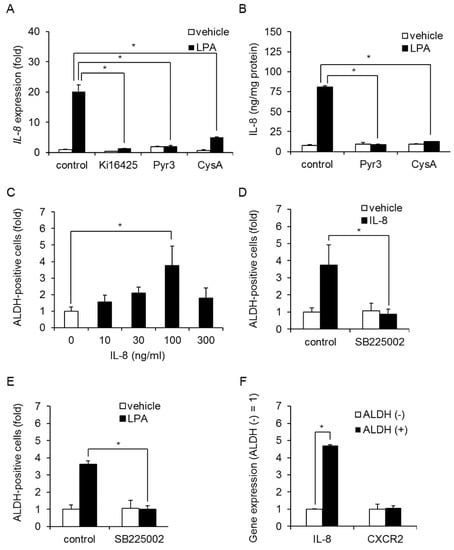 Role of IL-8 on LPA-induced increases in ALDH-positive cells in TNBC cells. (A) Effect of Ki16425 (10 µM), Pyr3 (1 µM), or CysA (10 µM) on LPA-induced IL-8 expression in MDA-MB-231 cells. Data represent the mean ± s.d. (n = 3). (B) Effect of Pyr3 (1 µM) or CysA (10 µM) on LPA-induced IL-8 secretion in MDA-MB-231 cells. The IL-8 content of the conditioned medium was measured by ELISA. Data represent the mean ± s.d. (n = 3). (C) Effect of IL-8 on the proportion of ALDH-positive cells in MDA-MB-231 cells. Data represent the mean ± s.d. (n = 3). (D) Effect of the IL-8 receptor antagonist SB225002 (1 µM) on the IL-8-induced proportion of ALDH-positive cells in MDA-MB-231 cells. Data represent the mean ± s.d. (n = 3). (E) Effect of the IL-8 receptor antagonist SB225002 (1 µM) on the LPA-induced proportion of ALDH-positive cells in MDA-MB-231 cells. Data represent the mean ± s.d. (n = 3). (F) IL-8 and CXCR2 expression in ALDH-positive and ALDH-negative cells by qPCR. Data represent the mean ± s.d. (n = 3). * p < 0.05.