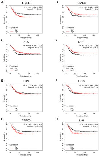 The effect of LPA signaling factors on the prognosis of TNBC patients. Distant metastasis free-survival of TNBC patients (n = 424) was analyzed using Kaplan–Meier Plotter (https://kmplot.com/analysis/index.php?p=background, accessed on 7 February 2022) according to expression of LPAR3 (A), LPAR6 (B), ATX (C), LPP1 (D), LPP2 (E), LPP3 (F), TRPC3 (G) and IL8 (H). The TNBC patient samples were divided into high expression and low expression groups by median. Hazard ratio (HR) and logrank P value are indicated in each panel.