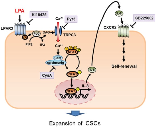 In this study, we used the ALDH assay to identify potential regulators of BCSC levels in TNBC and determined that LPA/LPAR3 signaling and subsequent TRPC3 activation resulted in increased BCSC numbers through the Ca2+-dependent transcriptional activation of IL-8 by NFAT (Figure 10). The findings presented here broaden our understanding of the role of lipid signaling in the development of breast cancer.