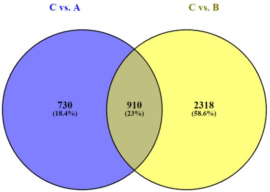 The Venn diagram of common and unique differentially expressed genes (DEGs) following the comparisons of BPV-E4 (A) vs. control (C) groups, and BPV-E1^E4 (B) vs. control (C) groups (Venny 2.1 BioinfoGP).