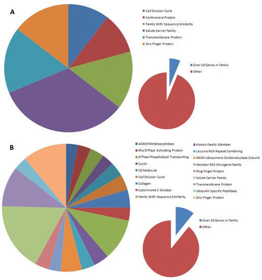 Pie charts that depict the contribution of families with 10 or more genes undergoing expression changes identified following the sarcoid-dependent oncogenic transformation of equine ACFCs triggered by nucleofection with either BPV-E4 (A) or BPV-E1^E4 (B) transgenes.