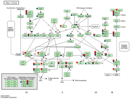 Cell cycle pathway (ecb 04110) over-represented following two strategies of sarcoid-dependent neoplastic transformation triggered by either BPV-E4 or BPV-E1^E4 transgenes. The red squares denote genes modified by BPV-E4 insert, while the blue circles indicate BPV-E1^E4 transgene-induced modifications; arrows present molecular interaction or relation, while dotted arrows show indirect link or unknown reaction.