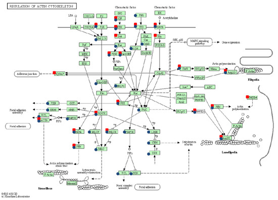 Furthermore, as has been revealed by the pathway enrichment analysis, modifications observed in the cell cycle (Figure 3), regulation of actin cytoskeleton (Figure 4), and ECM remodeling (reflected in the alterations recognized for focal adhesion and ECM-receptor interaction) have been proven among neoplastically transformed equine ACFCs exhibiting expression of either BPV-E4 or BPV-E1^E4 transgenes.