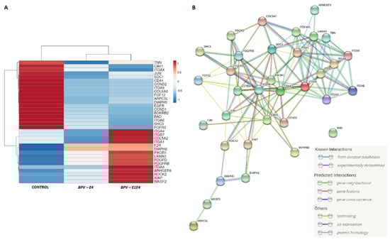 The interactions between 34 genes identified in both BPV-E4 and BPV-E1^E4 transgenic cells, and belonged to focal adhesion, regulation of actin cytoskeleton, and ECM-receptor interaction pathways. (A) the heatmap of the mean expression for groups (R package [23]); (B) the inter-relations between identified DEGs (String software [24]).