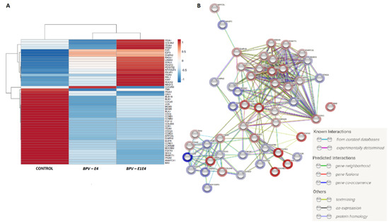 The interactions between 51 genes identified in both BPV-E4 and BPV-E1^E4 transgenic cells undergoing sarcoid-dependent neoplastic transformation, and belonged to molecular pathways related to procancerous intracellular conversion: (A) the heatmap of the mean expression for groups (R package [23]); (B) the interaction between identified DEGs with FC direction marked (String software [24]).