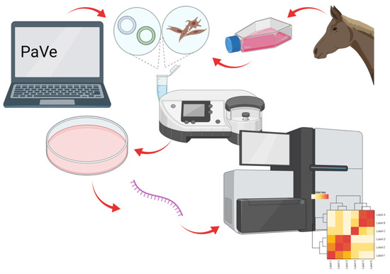 The experimental protocol (as depicted in Figure 7) was divided into three main steps: (1) designing and preparing the transgene sequences to be expressed in equine ACFCs; (2) nucleofection-mediated neoplastic transformation of ACFCs prompted by BPV-E4 and BPV-E1^E4 transgenes; and (3) analysis of transcriptome changes in BPV-E4 and BPV-E1^E4 transgenic cells.