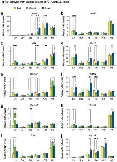 To define whether nutrient availability affects Mg2+ homeostasis, we decided to determine the expression levels of genes encoding Mg2+ channels, exchangers and transporters. To do this, we harvested several metabolic tissues, including the liver, small intestine, colon, and kidney cortex of wild-type C57BL/6J mice in a normal-chow diet fed, fasted, or refed condition.