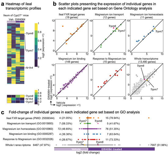 FXR agonism induces Trpm6 expression in the ileum of Cyp27-/- mice. (a) Heatmap showing the whole ileal transcriptome profile and the expression of Trpm6, Nr1h4 (also known as Fxrα), and Trpm7 in either vehicle or GW4064-administrated Cyp27-/- mice (NCBI’s Gene Expression Omnibus, accession number GSE40821) [64]. (b,c) Scatter plots representing the expression (b) and fold-change (c) of individual genes included in each indicated gene set (Gene Ontology).