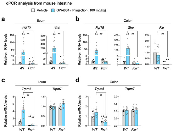 It is of interest to note that Trpm6 expression was markedly reduced in both the ileum and colon of Fxr-/- mice (Figure 3c,d), indicating that FXR is necessary for sustaining a basal Trpm6 expression in the intestine. As shown in Cyp27-/- mice, GW4064 markedly increased Trpm6 expression in the ileum of WT mice, which was completely lost in Fxr-/- mice (Figure 3c), suggesting that increased expression of ileal Trpm6 gene upon GW4064 treatment is absolutely dependent on FXR. In contrast to a dynamic regulation of Trpm6 transcription, Trpm7 expressions were nearly unaltered by either the loss of FXR or GW4064 treatment (Figure 3b). Consistent with our results, Bijsmans et al. has also reported a similar finding showing that OCA treatment increased Trpm6 expression in both ileum and intestinal organoids of WT mice but not in those of Fxr-/- mice [66].
