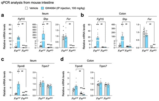 Cell-autonomous activation of FXR in ileal epithelial cells is required for increasing Trpm6 expression in response to the treatment of GW4064. Ad libitum fed FxrF/F mice and FxriKO mice on a normal chow diet were intraperitoneally injected with vehicle or GW4064 (100 mg/kg BW) twice a day (00:00 a.m. and 12:00 p.m.) for a 24 h. n = 8 per group. All mice were sacrificed, and tissues were collected at 17:00–18:00. (a,b) Expression levels of genes encoding FGF15, SHP, FXR, TRPM6, or TRPM7 were determined in the ileum (a,c) and colon (b,d) by qPCR analysis. ** p < 0.01 vs. wild-type mice treated with vehicle, ## p < 0.01 as analyzed by two-tailed Student’s t-test. Data points show individual mice. Data are mean ± s.e.m. WT, wild-type; GW, GW4064.