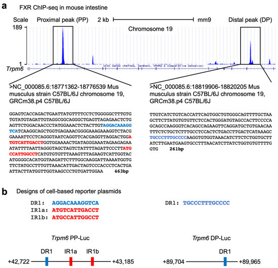 To investigate whether Trpm6 is a direct FXR target gene, we analyzed FXR-ChIP seq data sets performed in the mouse intestine by the Guo laboratory [54]. We found that there were a couple of prominent FXR binding peaks in the intron regions of the Trpm6 gene. Among them, we focused on two major peaks, a proximal peak (PP, +42,722 to +43,185) and a distal peak (DP, +89,704 to +89,965) (Figure 5a). A bioinformatic analysis of these sequences using the NHR-scan program [67] allowed us to identify that the proximal peak contains one DR1 response element and two IR1 response elements (denoted by IR1a and IR1b), and that the distal peak contains one DR1 response element (Figure 5a). It is of interest to note that the distal peak only contains a DR1 response element instead of an IR1 response element. Nevertheless, it has also been reported that FXR binds DR1 response elements in the promoter regions of human APOC3 and APOA genes and in the enhancer regions of mouse autophagy-related genes, where it functions as a negative transcriptional repressor [26,68,69].