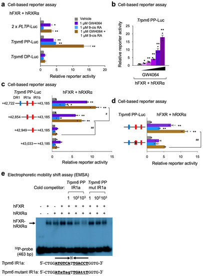 HeLa cells were maintained in the following media: DMEM high glucose supplemented with 10% FBS, and 1% penicillin/streptomycin antibiotics. For the luciferase assays, HeLa cells were cultured in 24-well plates. Transient transfections were performed using Lipofectamine 2000. Cells were transfected with 200 ng of reporter constructs (2 X PLTP-Luc, Trpm6 PP-Luc, or Trpm6 DP-Luc), 100 ng of cytomegalovirus-promoter (CMX)-human FXR, CMX-human RXRα, or both, and 50 ng of CMX-β-galactosidase. pCDNA3.1 was added to prepare the total DNA to 500 ng per well. After 16 h transfection, cells were treated with vehicle (0.1% DMSO), 1 μM GW4064, 1 μM 9-cis retinoic acid (RA), or a combination of GW4064 and 9-cis RA. Luciferase and β-galactosidase assays were performed 24 h after drug treatment. Luciferase activity was normalized with β-galactosidase activity. Normalized values from vehicle-treated cells were set as fold 1.
