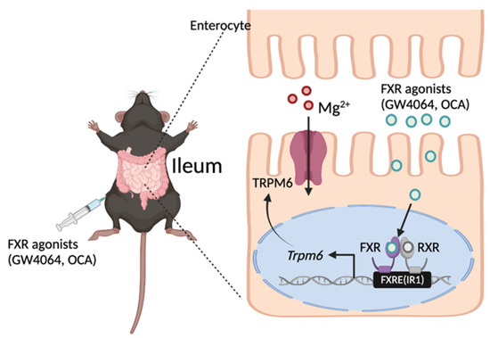 Working model of FXR-mediated Trpm6 expression in the small intestine. FXR directly binds to an inverted repeat 1 (IR1) response element in the regulatory region of mouse Trpm6 gene. As a result, FXR in the intestinal epithelial cells is required for maintaining basal expressions of Trpm6 in mice. Additionally, pharmacological activation of FXR using GW4064 or OCA is sufficient to increase expressions of Trpm6 in the ileum, but not in the colon of the mice. OCA, obeticholic acid; FXRE, FXR response element. A schematic diagram was created in BioRender.com.