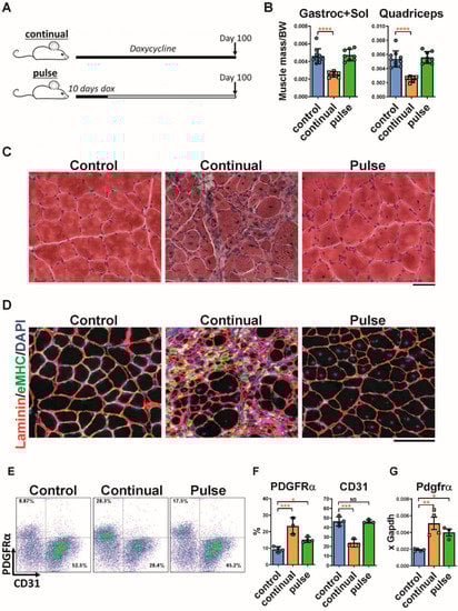 Previous long-term induction studies with the iDUX4pA mouse model showed that dystrophic muscle continually expressing DUX4 contained significantly elevated numbers of inflammatory cells as well as PDGFRα+ fibroadipogenic progenitors (FAPs), and reduced numbers of CD31+ endothelial cells and diminished microvasculature []. FACS analyses of muscle 3 months post-DUX4 pulse revealed that the frequency of inflammatory cells had declined to WT levels (Supplementary Figure S1), however the frequency of PDGFRα+ cells remained elevated (Figure 1E,F). Elevated expression of Pdgfrα in the muscle was also confirmed by RT-qPCR (Figure 1G). Mice continuously treated with doxycycline showed progressive muscle atrophy and FAP expansion.