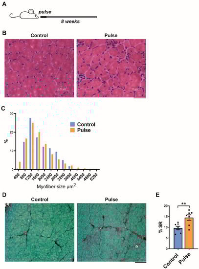 Fibrosis and myofiber size alterations 2 months after a 10 day pulse of DUX4. (A). Scheme of doxycycline pulse induction protocol in iDUX4pA;HSA mice. Mice received a pulse of doxycycline for 10 days. Muscles were analyzed histologically after 8 weeks of recovery, a time point at which they were 3 months of age. (B). Representative H&E image of TA muscle of iDUX4;HSA mice that were not doxycycline-induced (control) or pulse-induced mice (pulse). Scale bar 50 μm. (C). Myofiber size distribution in TA of control and pulse-induced mice. X-axis represents myofiber size distribution bins. (D). Representative images of Sirius Red/Fast Green staining of quadriceps from WT and iDUX4pA;HSA mice 8 weeks after a 10 day pulse of DUX4. Scale bar 100 μm. (E). Quantification of deposition of fibrous tissue in the muscle presented in (C). Data represent mean ± SEM; ** p < 0.01 by t-test, n = 6.
