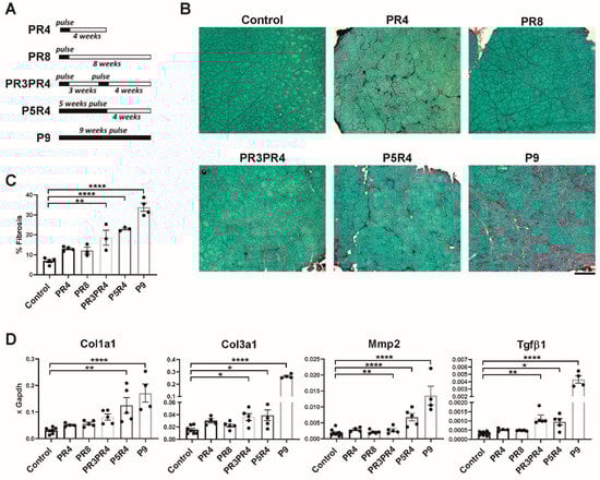 (A) Scheme of doxycycline pulse induction protocol in iDUX4pA;HSA mice. Mice received either a 10 day pulse, two such pulses, or a 5 week pulse. Muscles were analyzed histologically at the end of the indicated period. A continually induced control is indicated as a ‘9 weeks pulse’. (B) Representative Sirius Red/Fast Green images of TA muscle of iDUX4;HSA mice exposed to the different pulses of DUX4 shown in (A). Scale bar 100 μm. (C) Quantification of deposition of fibrous tissue in the muscle represented in (C). (D). RT-qPCR for genes related to fibrosis in gastrocnemius from mice exposed to the different pulses of DUX4 shown in (A). Data represent mean ± SEM; * p < 0.05 ** p < 0.01, **** p < 0.0001, by one-way ANOVA.