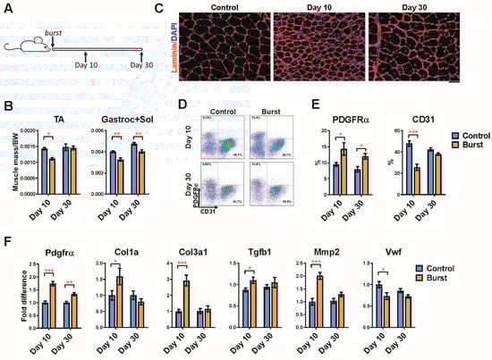 The studies above evaluated recovery from a 10 day period of transient DUX4 induction. To test the effects of the shortest possible period of expression, we treated animals with doxycycline via a single intraperitoneal (IP) injection (Figure 4A). We refer to this mode of induction as a ‘burst’ of DUX4. We observed a decline in muscle mass of both the TA and the gastrocnemius-soleus 10 days post-burst, which was fully recovered in the TA one month post-burst, and improved but was not fully returned at the 30 day time point in the gastroc-soleus (Figure 4B). The single burst causes muscle damage and regeneration as visualized by centrally nucleated small fibers, smaller fiber size and elevated extracellular matrix deposition (Figure 4C). We investigated the loss of endothelial cells and expansion of FAPs by flow cytometry and found the expected increase in frequency of PDGFRα+ cells and decrease in endothelial cells (CD31) 10 days post-burst (Figure 4D,E). By day 30, the number of endothelial cells had returned to normal, however the number of FAPs remained significantly elevated. The expression of genes associated with FAPs, endothelial cells, and fibrosis supported these findings (Figure 4F). This suggests that burst expression of DUX4 in fibers leads to long-term changes, well past the time point of DUX4 expression, particularly in the fibroadipogenic compartment, even when gross histology is not abnormal.