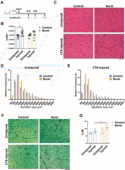 Quantification of fibrosis and myofiber sizing. The percent fibrosis in the TA was quantified on SR/FG-stained sections using ImageJ software. The image was first converted to grayscale based on green, and the threshold was adjusted. The area stained red was measured and normalized to cross-sectional area (CSA). The area of individual myofibers in the TA was quantified as described by []. Cellpose software was used to segment the images into individual myofibers. Fiber area was measured with the FIJI/ImageJ plugin, LabelsToROIs.