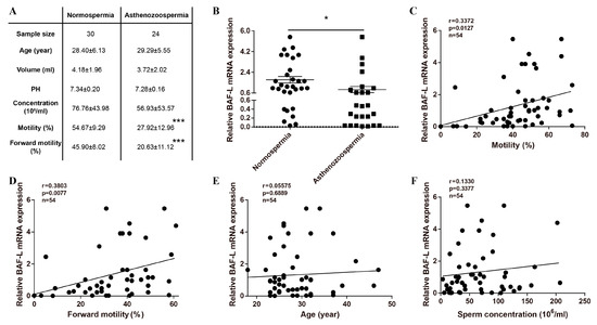 The testis is a unique organ where a significant number of genes are specific or prominently expressed, although the roles of most are not well defined, and BAF-L is such a gene. We focused on BAF-L during the course of screening risk factors for male infertility with spermatozoa from patients attending sterility evaluation (Figure 1A). We observed a decreased expression of BAF-L in the spermatozoa of asthenozoospermic subjects compared with normospermic ones (Figure 1B). To evaluate the correlation of BAF-L expression with different sperm parameters, a linear regression analysis was performed. Results show that the expression of spermatozoal BAF-L correlated with the sperm motility/forward motility (Figure 1C,D). No correlation was observed between the expression of spermatozoal BAF-L and the sperm concentration and the subject’s age (24 to 46 years old) (Figure 1E,F). These data reveal spermatozoal BAF-L is implicated in some forms of male infertility and suggest a role of BAF-L in regulating spermatozoal function.