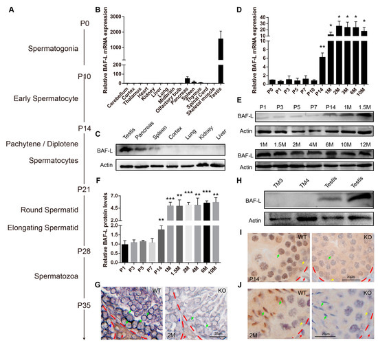 In mice, spermatozoa are generated by regular and continuous spermatogenic waves in an age-dependent manner (Figure 2A) [17,18]. To understand the roles of BAF-L in spermatogenesis, we first examined the temporal and spatial expression profile of BAF-L in mouse testes. We found BAF-L mRNA expressed in the thymus, spleen, pancreas, and most abundantly in testis (Figure 2B), and this was further validated by Western blots (Figure 2C). The testicular BAF-L mRNA and protein levels keep increasing in parallel with the first spermatogenic wave beginning from two weeks after birth and remain high throughout adulthood (Figure 2D–F). In situ hybridization showed that BAF-L mRNA was strongly expressed within the seminiferous tubules, especially in the germ cells of adult testes, and fewer signals were observed in Leydig or Sertoli cells (Figure 2G), revealing BAF-L as a male germ cell marker. Consistent with this, no immunoblotting evidence of BAF-L was observed in mouse Leydig or Sertoli cell lines (TM3 or TM4 cells), respectively (Figure 2H). These findings were further validated by immunohistochemistry staining with a BAF-L-specific antibody, showing BAF-L was present in male germ cells both at the juvenile and adult age (Figure 2I,J). Most importantly, we noticed that at the adult age, BAF-L was highly concentrated in the nucleus of elongating/elongated spermatids (Figure 2J). This is also consistent with the finding that increased expression of BAF-L in mouse testes reaches its peak around 4 weeks of age (Figure 2D–F), when elongating/elongated spermatids make up most of the testicular cells [17]. This germ cell’s expression and spermatogenic-wave-associated characteristics of BAF-L suggest its role in spermatozoal maturation and function.