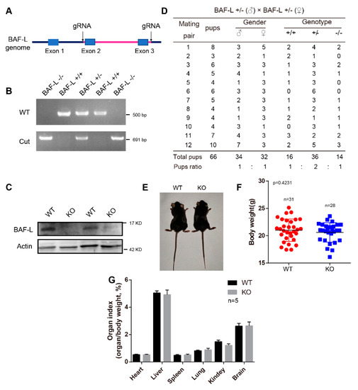 To further examine the biological functions of BAF-L, we generated a BAF-L knockout mouse (BAF-L −/−, KO), in which the exon 2 and 3 of BAF-L were deleted (Figure 3A). The genotypes of the offspring were evaluated by PCR and the absence of the BAF-L protein was validated by immunoblotting (Figure 3B,C). We found that BAF-L KO mice could be born with an expected Mendelian ratio and displayed normal postnatal viability (Figure 3D). The bodyweights of adult KO mice were comparable with WT controls (Figure 3E,F), and no differences in the organ index of some important organs were observed in BAF-L KO mice (Figure 3G). These results suggest that BAF-L is not required for embryonic viability, which is different from BAF, the downregulation of which causes embryonic lethality [19].