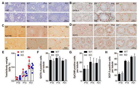 Spermatozoa are generated by repeated spermatogenic waves, which consist of three highly coordinated and complex steps [20]. First, spermatogonial stem cells undergo mitotic divisions and differentiation to generate spermatocytes; second, spermatocytes meiosis results in the formation of haploid spermatids that enter the third step, termed spermiogenesis, in which a series of morphological transformations progress [21]. During three weeks postnatal, when the first two steps of the initial spermatogenic wave were progressing, we found that BAF-L KO testes appeared to be morphological normally, as indicated by hematoxylin–eosin staining (H&E) (Figure 4A). The testis index (the ratio of testis and bodyweight) was also comparable between BAF-L WT and KO mice at the age of P10, P14, and P21 (Figure 4E). We further analyzed the homeostasis of different cell types during this period of testicular development, observing no changes in the cell numbers of Leydig or Sertoli cells (GATA-4-labeled) (Figure 4B,F), spermatogonia stem cells (EPCAM-labeled) (Figure 4C,G), or spermatocytes (SCP-3-labeled) (Figure 4D,H) in the testes of P10-, P14-, and P21-day-old BAF-L KO mice. These data reveal that BAF-L is not required for the early progress of spermatogenesis.
