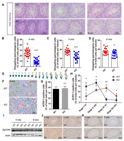 BAF-L deficiency causes defects in spermiogenesis. (A–D) Representative images of H&E staining and quantifications show decreased numbers of elongating germ cells in the BAF-L KO testis at the age of 4 weeks, 5 weeks, and 6 weeks. Error bars indicate SD. * p < 0.05, *** p < 0.001 by two-tailed Student’s t-test. Green arrows indicate elongating/elongated spermatids. (E) Illustration for the 16 developmental stages of mouse spermatids. (F) Representative images of ACRV-1 labeling in 4-week-old BAF-L KO testis. Red arrows indicate stage 1–4, green arrows indicate stage 5–8, blue arrows indicate stage 9–11, and purple arrows indicate 12–16. (G) Quantification shows comparable ACRV-1-positive cells in 4-week-old BAF-L KO testis. Error bars indicate SD. N.S by two-tailed Student’s t-test. n = 3 for WT and n = 4 for KO. (H) Quantification shows a delay in spermiogenic progress in 4-week-old BAF-L KO testis. Error bars indicate SD. * p < 0.05, ** p < 0.01 by two-tailed Student’s t-test. n = 3 for WT and n = 4 for KO. (I) Western blots show no difference in EpCAM protein level in 4-week-old and 8-week-old BAF-L KO testis. (J,K) Representative images of SCP3 and GATA-4 labeling in 4-week-old and 8-week-old BAF-L WT/KO testis.