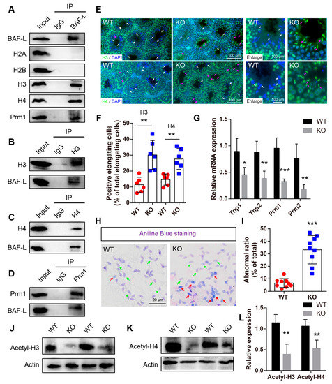 The histone–protamine exchange is one of the most important processes during spermiogenesis. As BAF-L interacts with both histones and protamine, we wondered if these interactions were implicated in the replacement of protamines with histones. To address this, immunofluorescence staining with antibodies of histones H3 and H4 was performed. We found that, at sexual maturity age, histones H3 and H4 were highly expressed from spermatogonia to round spermatids but were almost absent in elongating/elongated spermatids in WT mice (Figure 6E). However, in KO mice, widespread immunofluorescence labeling of histone H3 and H4 was observed in elongating/elongated spermatids (Figure 6E,F), suggesting defects in the exchange process of histones and protamines. Consistent with this, the qRT-PCR displayed robust decreased expressions of protamines (Prm1 and Prm2), as well as the transition proteins (Tnp1 and Tnp 2) in BAF-L KO mice (Figure 6G) [23]. Moreover, aniline blue staining, which evaluates spermatozoal chromatin defects related to their nucleoprotein content, revealed much more blue stain in BAF-L KO spermatozoa (Figure 6H,I), indicating the presence of lysine-rich histones in BAF-L KO spermatozoal nuclei [24]. The defects in the histones–protamines exchange may corelate with reduced acetylation of histones H3/H4 (Figure 6J–L), which is an important post-translational modification of histones that is critical for regulating spermiogenesis [25]. All these results display a critical role of BAF-L in spermiogenesis in regulating the exchange of histones and protamines through its interaction with them.