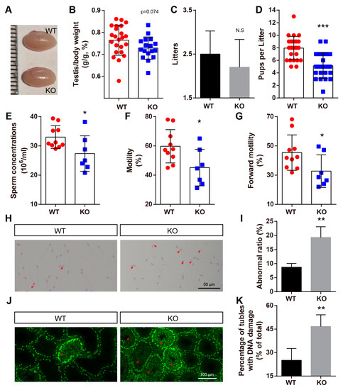 While defects in spermiogenesis were caused by BAF-L deficiency, the testicular size of adult BAF-L KO mice seemed comparable with that of WT controls, even though the testis index was slightly decreased (Figure 7A,B). The histone–protamine exchange defects could result in abnormal spermatozoal morphology, reduced sperm motility, and male fertility [23,26,27]. As we observed defects in spermiogenesis caused by an abnormal histone–protamine exchange, we further examined the male fertility of BAF-L KO males. We crossed 6-week-old BAF-L WT or KO males with WT females and examined their produced offspring for three months. Smaller, but not significantly, litters were produced during this period by BAF-L KO male mice (Figure 7C). However, we found the number of pups per litter of KO males was notably fewer than that of WT controls, indicating the reduced fertility of BAF-L KO males (Figure 7D). This result is consistent with our findings in infertile human subjects. To better elucidate the basis for the impaired male fertility of BAF-L KO mice, sperm parameters analysis was performed. Analysis of spermatozoa collected from cauda epididymis revealed a significant reduction in sperm concentration, motility, and forward motility (Figure 7E–G), indicating a condition similar to human oligo-asthenozoospermia [28]. Besides, an increased proportion of abnormal-appearing spermatozoa was produced by BAF-L KO mice (Figure 7H,I). Impaired sperm parameters and defects in the spermatozoal number and morphology may result from spermatogenic damages, as we observed widespread DNA damage in BAF-L KO testes, as indicated by γ-H2AX immunofluorescence labeling (Figure 7J,K). All these data reveal that BAF-L is important for spermatozoal function and suggest a germ-cell-intrinsic role of BAF-L in maintaining male fertility.