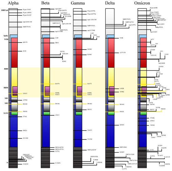 Considering coding and noncoding regions, Omicron carries at least 60 mutations in total compared with the original Wuhan strain. Many of those mutations are shared with the previously described VOCs, whereas others are uniquely found in Omicron (Figure 3). Similarly, there are 6 deletions (in positions 69, 70, 143, 144, 145, and 211) in the Omicron variant, of which only the one in position 211 does not appear in the other VOCs [12]. Crucial implications in infectiousness and immune escape regard at least 36 mutations in the S protein; over 30 amino acid substitutions, 3 deletions and 1 insertion are recorded. Notably, 15 of the 30 amino acid substitutions are in the receptor-binding domain (RBD) [13]. Lastly, the Omicron variant shares the mutations at the furin cleavage region with the other VOC. During the S protein cleavage process, the mutations in positions 547, 655, 679 and 681 allow the formation of two subunits which boost the transmissibility of the virus [12].