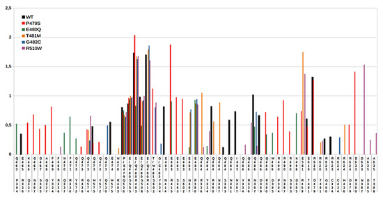 The most pronounced reduction in protein-protein interactions was observed in the case of the E480Q mutation of DPP III, where the loss of interaction of Q480 with R415 leads to a reorientation of R415 toward E483, which also interacts with the Kelch residue R380 (Figure 2 and Figure 3). However, this interaction is not as stable as in the P479S variant. Moreover, Q483 achieved negligible interactions with the Kelch domain during simulation compared to WT. Thus, the interaction of this residue with serine residues S555 and S508 of the Kelch domain is quite stable during the simulations, while R483 of the Kelch domain moved away from the ETGE motif. This is consistent with the worst binding energy obtained by the MM-GBSA calculations for the complex with this DPP III variant.