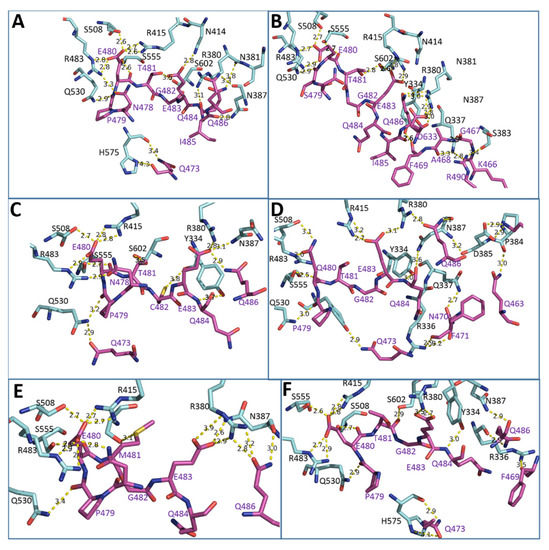 Interactions between the ETGE DPP III motif and the Kelch domain determined during MD simulations of the complex Kelch-DPP III, with DPP III variants (A) WT (B) P479S, (C) G482C, (D) E480Q, (E) T481M and (F) R510W. Residues involved in intermolecular hydrogen bonding are shown as sticks, DPP III residues are colored purple and residues of the Kelch domain colored cyan. The distances between the atom pairs forming hydrogen bonds are marked.