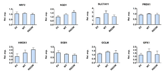 HEK293T cells grown in 6-well plates were transfected with the pFLAG-CMV2 empty vector (EV) and vectors for the expression of WT or the R623W variant of the DPP III protein, respectively, and then treated with 400 µM H2O2. The RNA was isolated and reverse transcribed and the resulting cDNA was analyzed by RT-qPCR to determine whether the expression of WT or the DPP III variant affects the expression of 8 NRF2 controlled genes, NRF2, NQO1, HMOX1, PRDX1, SOD1, GCLM, SLC7A11 and GPX1. The results of the expression analysis are shown in Figure 4. The only significant difference was in the expression of NQO1 between cells overexpressing DPP III-R623W and the EV-transfected cells. The differences in the expression of other NRF2-controlled genes between DPP III overexpressing cells and EV-transfected cells were not statistically significant.