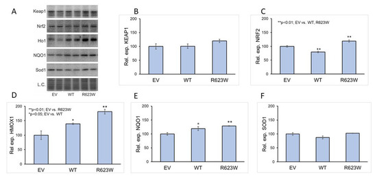 Western blot analysis of the relative expression of KEAP1, NRF2, HMOX1 (Ho1), NQO1 and SOD1 in the cells transfected with EV, WT and R623W, respectively. (A), A graphical display of the averaged densitometry values obtained by the analysis of the western blot bends in ImageLab v. 6.1.0. (Bio-Rad Laboratories, Inc., Hercules, CA, USA), normalized to loading control (L.C.) KEAP1 (B), NRF2 (C), HMOX1 (E), NQO1 (D) and SOD1 (F) protein expression is presented. For the statistical analysis of data, SPSS for Windows (v.17.0, IBM, Armonk, NY, USA) was used. (NRF2: ** p < 0.01 EV vs. WT, ** p < 0.01 EV vs. R623W; HO1: * p < 0.01 EV vs. R623W, ** p < 0.05 EV vs. WT; NQO1: * p < 0.01 EV vs. R623W, ** p < 0.05 EV vs. WT).