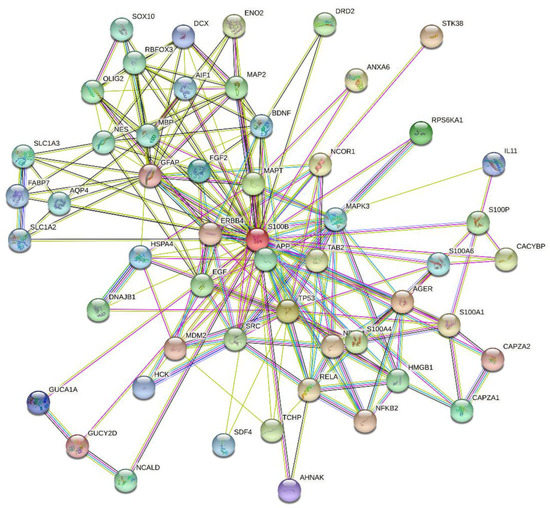 S100B-centered protein–protein interaction (PPI) network generated by STRING using high confidence level of 0.7 [47]. In this network, the nodes correspond to proteins, whereas the edges show predicted or known functional associations. Seven types of evidence are used to build the corresponding network, and are indicated by the differently colored lines: a green line represents neighborhood evidence; a red line—the presence of fusion evidence; a purple line—experimental evidence; a blue line—co-occurrence evidence; a light blue line—database evidence; a yellow line—text mining evidence; and a black line—co-expression evidence [47]. This network includes 53 proteins connected by 205 interactions. As a result, an average node degree of this network is 7.74.