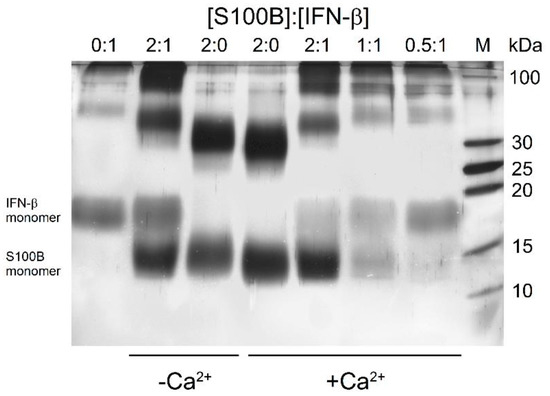 SDS-PAGE results for 5 μM IFN-β with/without Ca2+-depleted/bound S100B (S100B to IFN-β molar ratios are indicated) cross-linked with EDAC/sulfo-NHS at 25 °C.