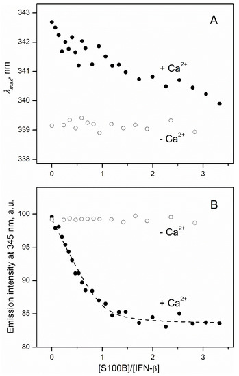 IFN-β interaction with S100B at 25 °C (1 mM CaCl2 or 5 mM EDTA, pH 7.4), monitored by tryptophan fluorescence of IFN-β (0.5 μM; excitation at 295 nm). (A) Spectrum maximum position; (B) emission intensity at 345 nm. The points are experimental, while the dashed curve is theoretical, fitted according to the one-site binding model.