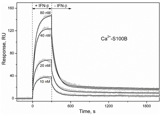 Kinetics of the interaction between IFN-β and Ca2+-bound S100B at 25 °C (1 mM CaCl2, pH 7.4), monitored by SPR spectroscopy using IFN-β as an analyte (10–80 nM) and S100B as a ligand. Grey curves are experimental, while black curves are theoretical, calculated according to the heterogeneous ligand model [1] (see Table 1 for the fitting parameters).