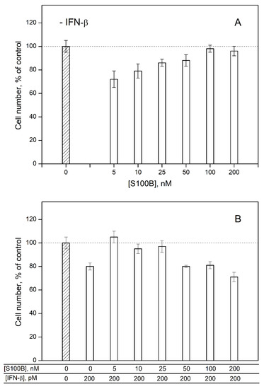 Furthermore, an increase in S100B concentration up to 100–200 nM is accompanied by the loss of its effect on the viability of MCF-7 cells (Figure 5A) and recovery of the inhibitory activity of IFN-β under combined use with S100B (Figure 5B). Hence, the elevated S100B level disrupts the non-additivity of the cellular effects induced by IFN-β and S100B, possibly due to the formation of some higher-order multimers of S100B [60]. Overall, IFN-β and 5–25 nM S100B exert non-additive effects on the viability of MCF-7 cells, thereby evidencing the S100B binding to IFN-β, which reverses the IFN-β activity towards the cells. The inhibition of the IFN-β-induced suppression of viability of MCF-7 cells was previously shown also for S100A1/A4/P proteins [30,31].