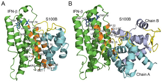 The models of tertiary structures of IFN-β (shown in green) bound to Ca2+-loaded S100B monomer (A) or dimer (B). Crystal structures of IFN-β and Ca2+-loaded S100B dimer (PDB entries 1AU1 and 5D7F, respectively) are used for the modeling by ClusPro docking server [61]. The model of S100B monomer is built using I-TASSER server [62]. The Ca2+-binding loops are shown in yellow. The numbering of the contact residues (orange-colored) is according to the PDB entries.