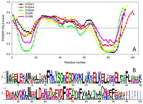 (A) Intrinsic disorder predisposition of human S100B protein in comparison with the disorder profiles of human S100 proteins capable of IFN-β binding, estimated using PONDR® VSL2 algorithm (http://www.pondr.com/ accessed on 26 November 2021). The plot represents data for the sequences aligned using Clustal Omega [64], and breaks in the curves correspond to the alignment gaps. (B) Sequence logo representation of human S100B, S100A1, S100A4, S100A6, and S100P proteins generated by the WebLogo tool (http://weblogo.threeplusone.com/ accessed on 26 November 2021) [65,66].